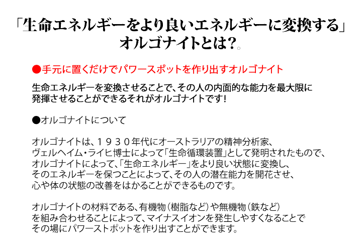 オルゴナイトの材料である、有機物(樹脂など)や無機物(鉄など) を組み合わせることによって、マイナスイオンを発生しやすくなることで その場にパワーストポットを作り出すことができます。